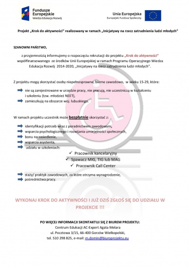 z przyjemnością informujemy o rozpoczęciu rekrutacji do projektu „Krok do aktywności” współfinansowanego ze środków Unii Europejskiej w ramach Programu Operacyjnego Wiedza Edukacja Rozwój 2014-2020, „Inicjatywy na rzecz zatrudnienia ludzi młodych”.